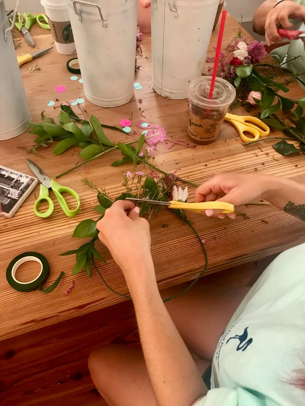 After the group finishes up the base of the crown we move to teaching the bachelorette party how to add on the greenery and the flowers. This is the fun part because everyone's personality comes through in their flower crowns. Always fun to see who gets super into it and love seeing everyone's creativity flow through their designs.