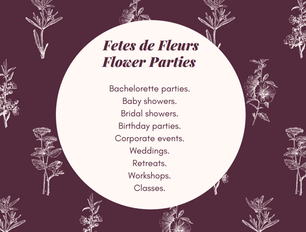 We are a flower party business. Fetes de Fleurs is FRENCH-ish for "Flower Parties." I moved to Charleston, SC from Boston, MA 1 1/2 years ago. I have always been entrepreneurial and have always wanted to start a business. The timing was right so I went for it. We host flower crown parties for celebrations like bachelorette parties, baby and bridal showers, events, birthdays, etc. We go to the location of the party and setup a flower crown bar with all the supplies to make flower crowns. Then we teach the group how to make flower crowns over some rose usually.